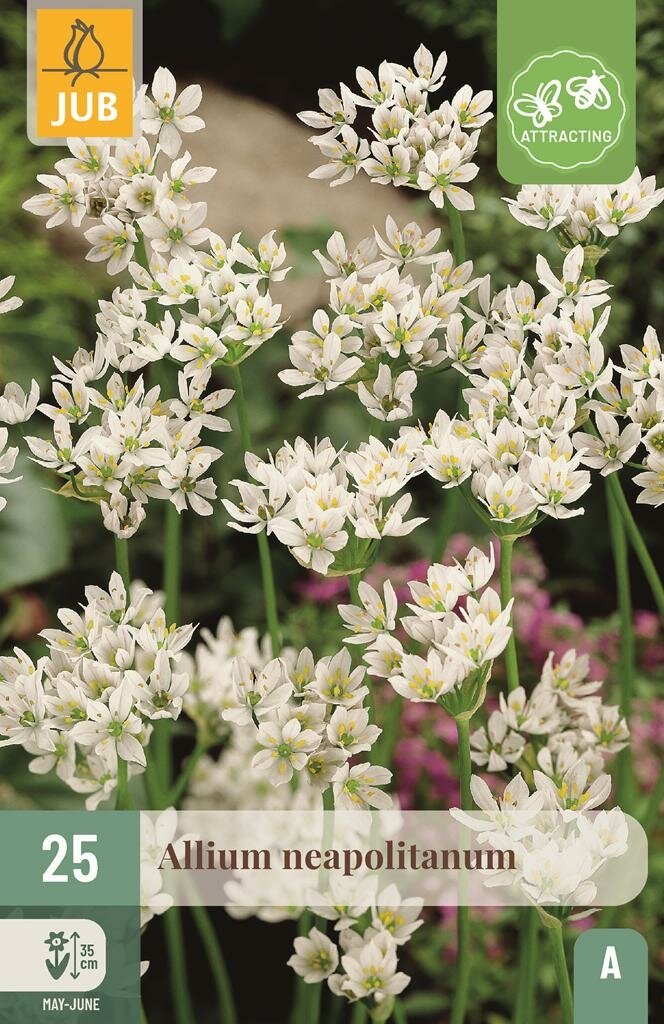 Allium Neapolitanum: Elegante Witte Sierui voor je Tuin. Allium Neapolitanum, ook bekend als de Napelse sierui, is een charmante bloembol die je tuin in het voorjaar voorziet van sierlijke witte bloemen. Deze verfijnde sierui van het merk Jub brengt met zijn stervormige bloemen een elegante uitstraling in borders, rotstuinen en natuurlijke beplantingen. Met 25 bollen in één verpakking creëer je direct een indrukwekkend effect in je tuin.