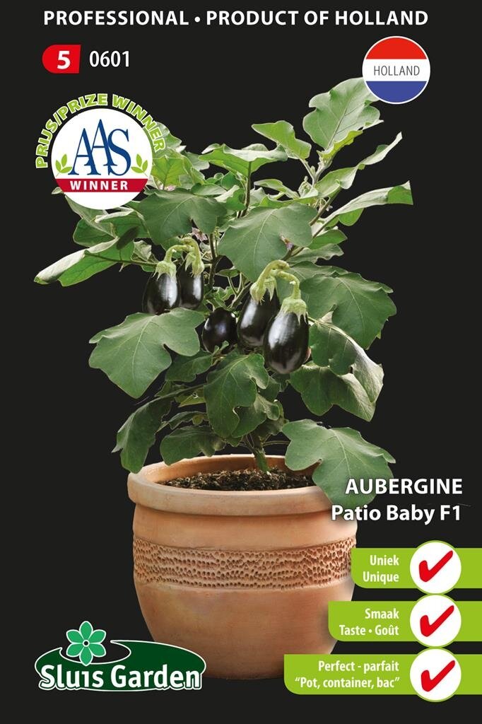 Aubergine Patio Baby F1: Compacte schoonheid voor balkon en patio. Aubergine Patio Baby F1 is een bekroonde, compacte aubergineplant die speciaal ontwikkeld is voor het kweken in potten op balkons en patio's. Deze All America Selections (AAS) winnaar van Sluis Garden combineert een beperkte hoogte van slechts 50 cm met een rijke opbrengst van heerlijke, zachte baby-aubergines van ongeveer 7,5 cm lang.