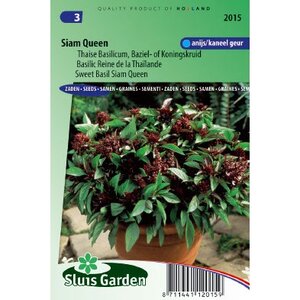 Basilicum zaden Siam Queen hiervan heeft het blad een heerlijke kruidige, aromatische smaak en zit tussen kaneel en anijs in. Pas op het laatste moment aan een gerecht toevoegen. De topbladeren kleuren van groen naar rood. Zaaien onder glas, zaden niet bedekken, licht aandrukken en vochtig houden. Als de plantjes voldoende groot zijn uitplanten in potten en bakken of op een warm plekje in de volle grond. Ook als sierplant in potten heel fraai.