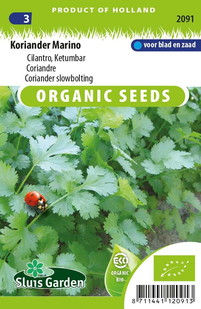 Biologische Koriander Marino BIO: Verfijnde smaakmaker voor je keuken. Biologische Koriander zaden Marino BIO is een verbeterde variant van de standaard koriander, ontwikkeld door Sluis Garden. Deze biologisch geteelde koriander is beter bestand tegen vroegtijdig doorschieten en kenmerkt zich door een mooi dicht blad, dunne stengels en een zeer gezond gewas. Koriander, ook bekend als Cilantro, biedt twee unieke smaken: het frisse, peterselieachtige blad en de aromatische zaden die als specerij worden gebruikt.
