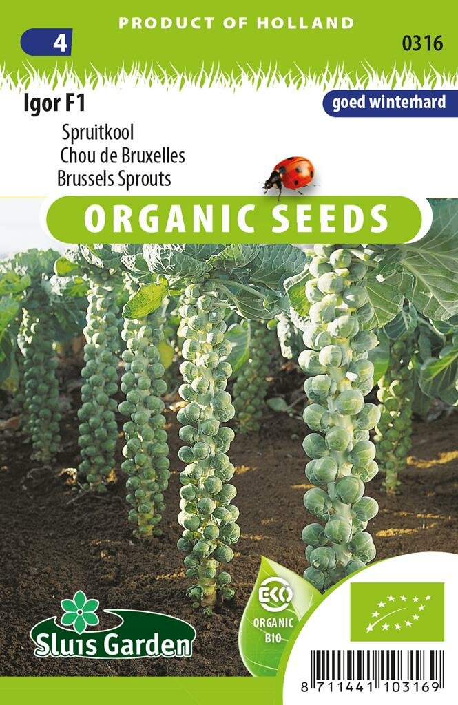 Biologische Spruitkool zaden Igor F1: Kwaliteitsvolle hybride voor een rijke oogst. Biologische Spruitkool zaden Igor F1 is een hoogwaardige hybride tuinderssoort van Sluis Garden, speciaal ontwikkeld voor een rijke oogst van november tot half januari. Deze biologisch geteelde zaden leveren krachtig groeiende planten met donkergroene, gladde spruitjes die van onder tot boven in gelijkmatige kwaliteit geoogst kunnen worden. De planten zijn bovendien zeer goed vorstbestendig, waardoor je ook in koude periodes kunt blijven oogsten.