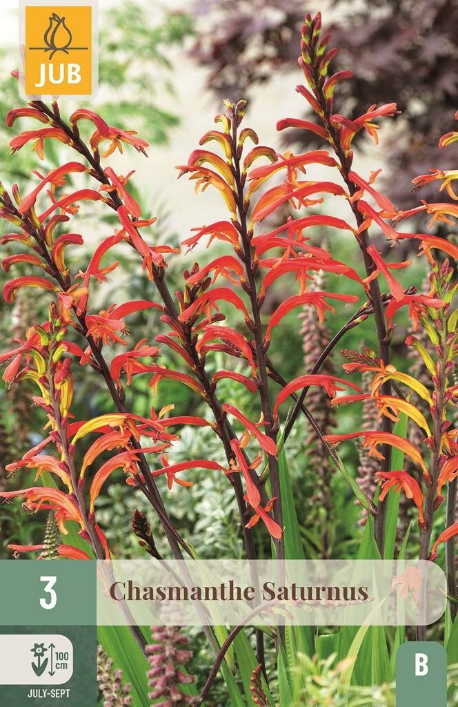 Ontdek de exotische Chasmanthe Saturnus voor je tuin. Chasmanthe saturnus is een prachtig bolgewas dat steeds populairder wordt onder tuinliefhebbers en snijbloemkwekers. Dit fraaie gewas, afkomstig uit Zuid-Afrika, heeft een opbouw die lijkt op die van de Montbretia (Crocosmia). De Jub collectie brengt deze bijzondere plant nu ook naar jouw tuin, waar hij met zijn opvallende oranje buisvormige bloemen een exotische sfeer creëert.