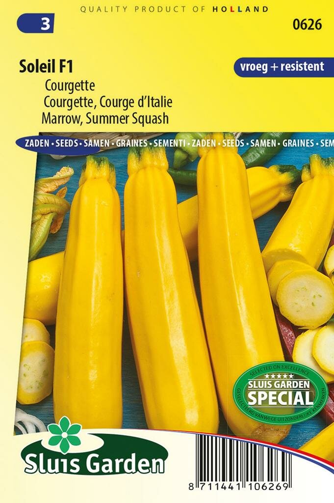 Courgette Zaden Soleil F1: Goudgele Pracht voor je moestuin. Courgette zaden Soleil F1 zijn een prachtige toevoeging aan je moestuin. Deze zaden van het kwaliteitsmerk Sluis Garden produceren cilindrische, gladde, goudgele vruchten met heerlijk crèmewit vruchtvlees. Het middelvroege ras is goed resistent tegen meeldauw, waardoor je langer kunt genieten van een rijke oogst. De planten vormen geen ranken, wat ze ideaal maakt voor teelt in grote potten of kleinere tuinen.