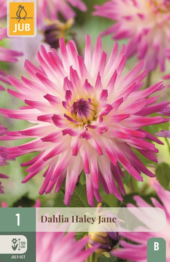 Dahlia Hayley Jane: Spectaculaire cactus dahlia voor je tuin. De Dahlia Hayley Jane is een prachtige cactus dahlia met opvallende roze en witte bloemen die je tuin direct opfleurt. Deze knol van het kwaliteitsmerk Jub zorgt voor een spectaculaire bloei van juli tot en met oktober. Met zijn indrukwekkende hoogte van 120 cm is deze dahlia een echte blikvanger in borders en als snijbloem in boeketten.