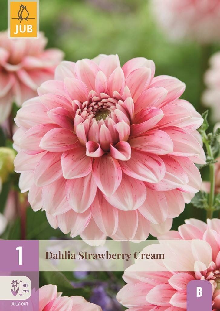 Dahlia Strawberry Cream: Een prachtige roze zomerbloeier. Maak kennis met de Dahlia Strawberry Cream, een schitterende decoratieve dahlia met een opvallende roze kleur die je tuin deze zomer een elegante uitstraling geeft. Deze knol van het kwaliteitsmerk Jub groeit uit tot een indrukwekkende plant van ongeveer 90 cm hoog en bloeit uitbundig van juli tot en met oktober. De Dahlia Strawberry Cream is perfect voor zowel borders als snijbloemen en brengt maandenlang kleur in je tuin.
