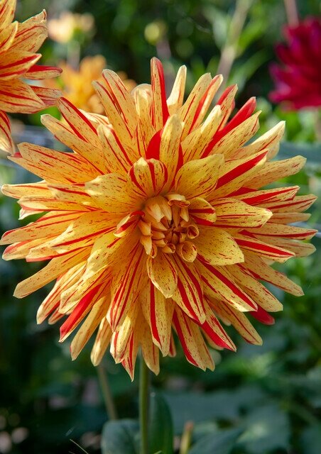 Dahlia Striped Vulcan: Spectaculaire tweekleurige Cactus dahlia. Maak kennis met de Dahlia Striped Vulcan, een indrukwekkende cactus dahlia van het kwaliteitsmerk Jub. Deze opvallende zomerbloeier kenmerkt zich door zijn spectaculaire tweekleurige bloemen in geel en rood, die een ware blikvanger in je tuin vormen. Met zijn imposante hoogte van 130 cm en zijn rijke bloei van juli tot en met oktober, brengt deze dahlia maandenlang kleur en leven in je zomertuin.
