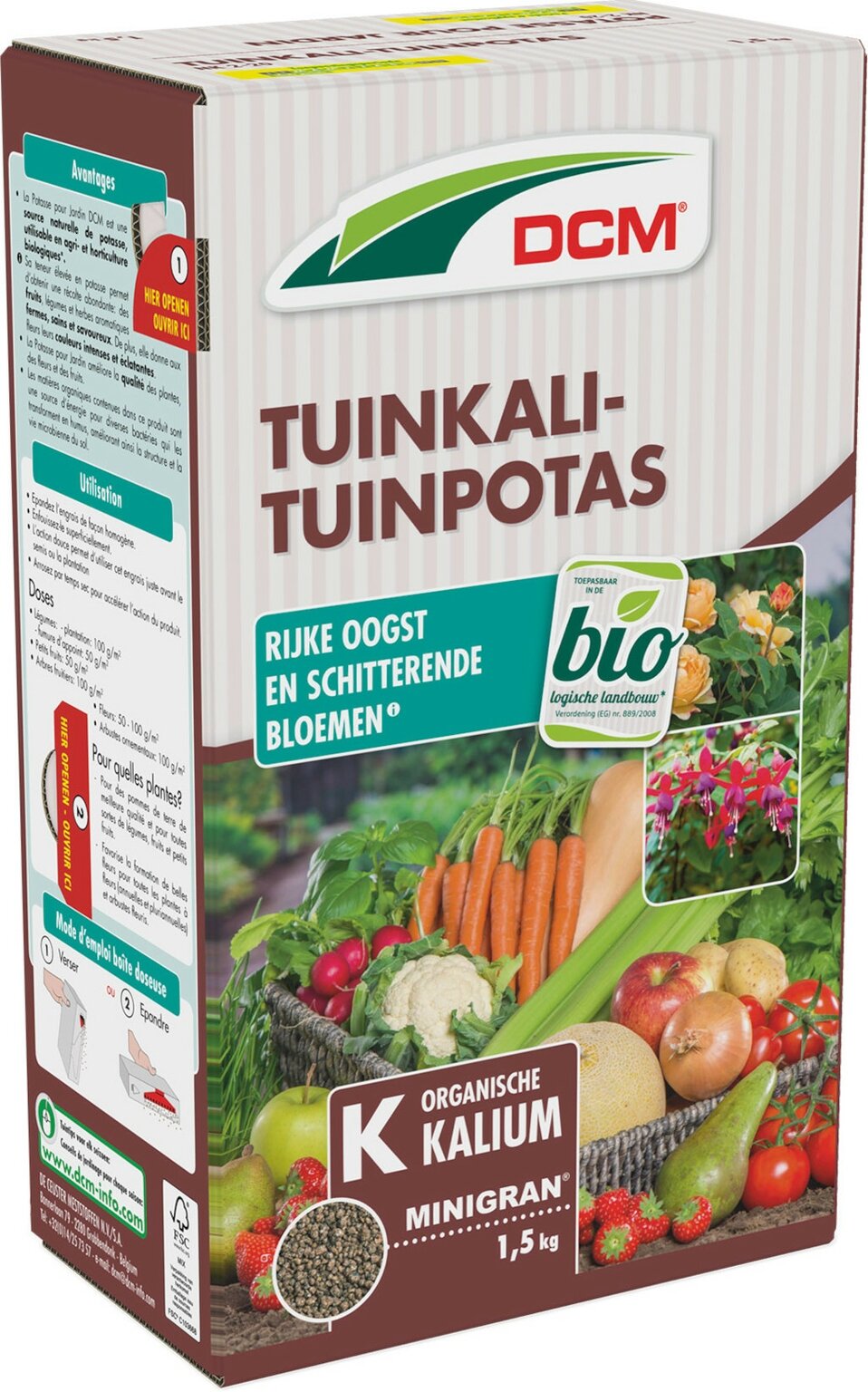 DCM tuinkali / tuinpotas 1.5 kg is een hoogwaardige organische meststof die zorgt voor de vorming van dikke vruchten en intensere bloemkleuren. Dit kwaliteitsproduct van DCM is speciaal ontwikkeld voor gebruik bij aardappelen, tomaten, uien, kolen en andere vrucht- en knolgroenten. De plantaardige potas is volledig toepasbaar in de biotuin en levert uitstekende resultaten voor zowel groenten als sierplanten.
