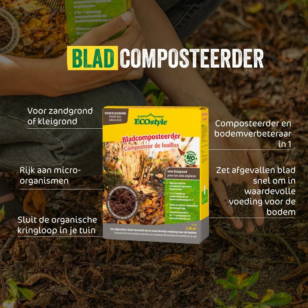 Ecostyle Bladcomposteerder Kleigrond is een innovatieve oplossing van het merk Ecostyle voor tuinliefhebbers die hun afgevallen bladeren willen omzetten in waardevolle compost. Dit product versnelt het composteringsproces aanzienlijk en is speciaal ontwikkeld voor kleigronden. De unieke samenstelling zorgt niet alleen voor snellere compostering, maar verbetert tegelijkertijd de structuur van je kleigrond.