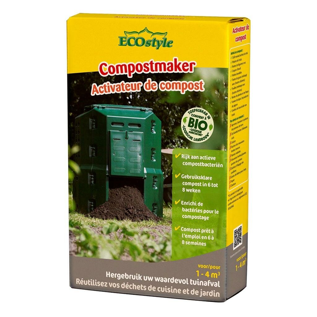 Ecostyle Compostmaker is een hoogwaardige oplossing van ECOstyle voor iedereen die op een natuurlijke manier tuinafval wil omzetten in voedzame compost. Dit product bevat verschillende soorten actieve bacteriën en essentiële voedingselementen die het composteringsproces aanzienlijk versnellen en verbeteren, waardoor je in ongeveer 8 weken tijd rijke, kruimelige compost krijgt die heerlijk geurt naar bosgrond.