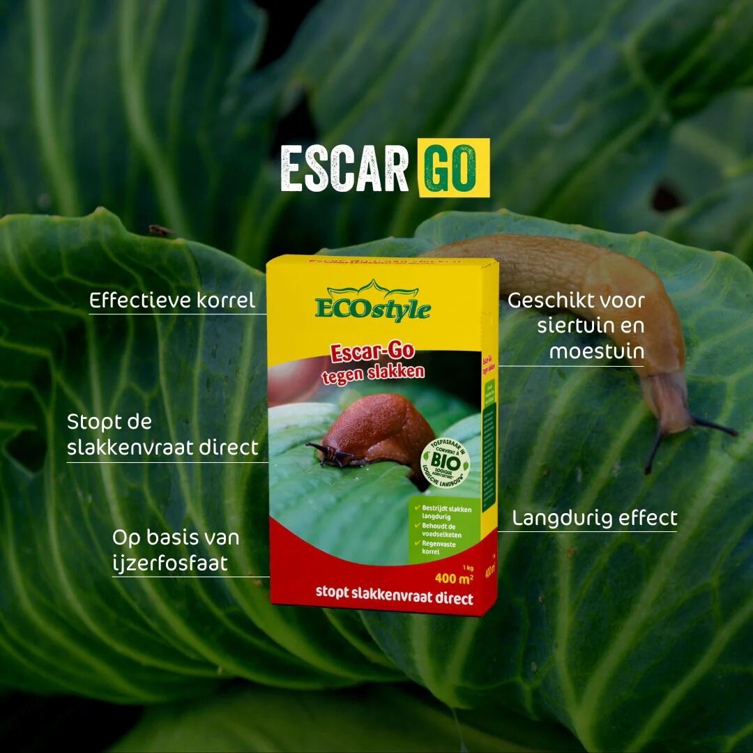 ECOstyle Escar-Go is de nummer 1 in natuurlijke slakkenbestrijding voor je tuin. Dit effectieve middel van ECOstyle biedt een directe oplossing tegen slakkenvraat zonder schadelijke gevolgen voor huisdieren, egels en vogels. De korrels zijn zeer waterbestendig en hebben een opvallende kleur, waardoor ze gemakkelijk te doseren zijn. Met één verpakking van 200 gram kun je maar liefst 80 m² tuin beschermen tegen vraatzuchtige slakken.