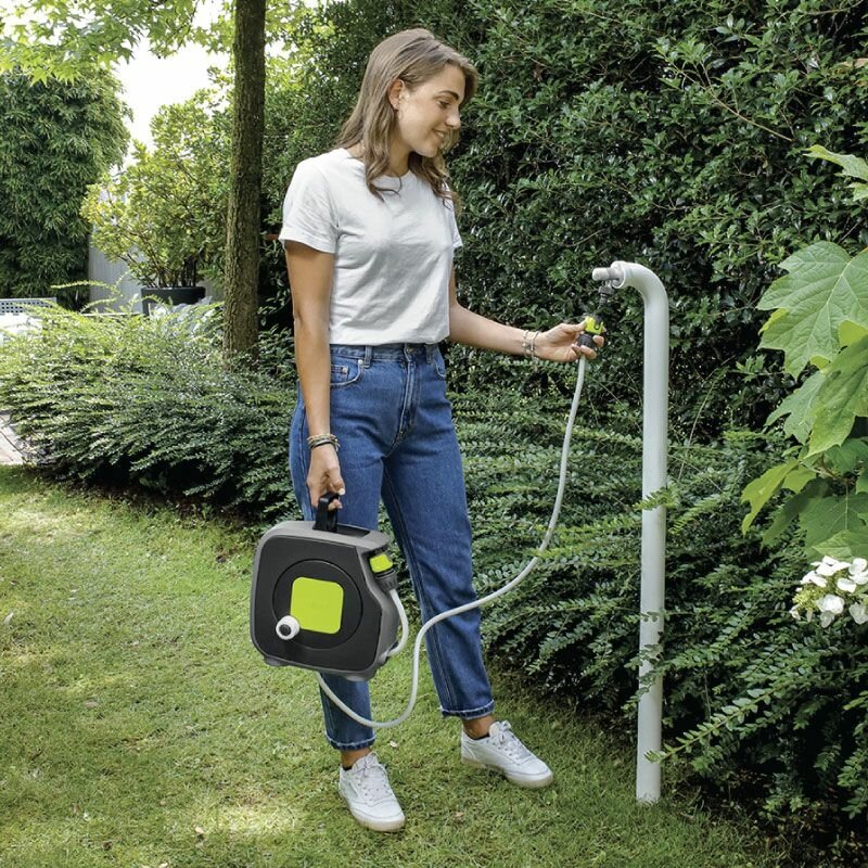 De GF Aquabag slanghaspel is speciaal ontworpen voor gebruik in kleinere buitenruimtes zoals balkons, terrassen en compacte tuinen. Door het handige draagbare ontwerp kun je gemakkelijk bewegen tussen verschillende plantenzones zonder de hele slang te moeten verplaatsen. Het sproeipistool met 8 verschillende functies stelt je in staat om de waterstraal aan te passen aan de behoeften van verschillende planten - van een zachte nevel voor delicate bloemen tot een krachtigere straal voor het reinigen van tuinmeubilair of het besproeien van moeilijk bereikbare planten.