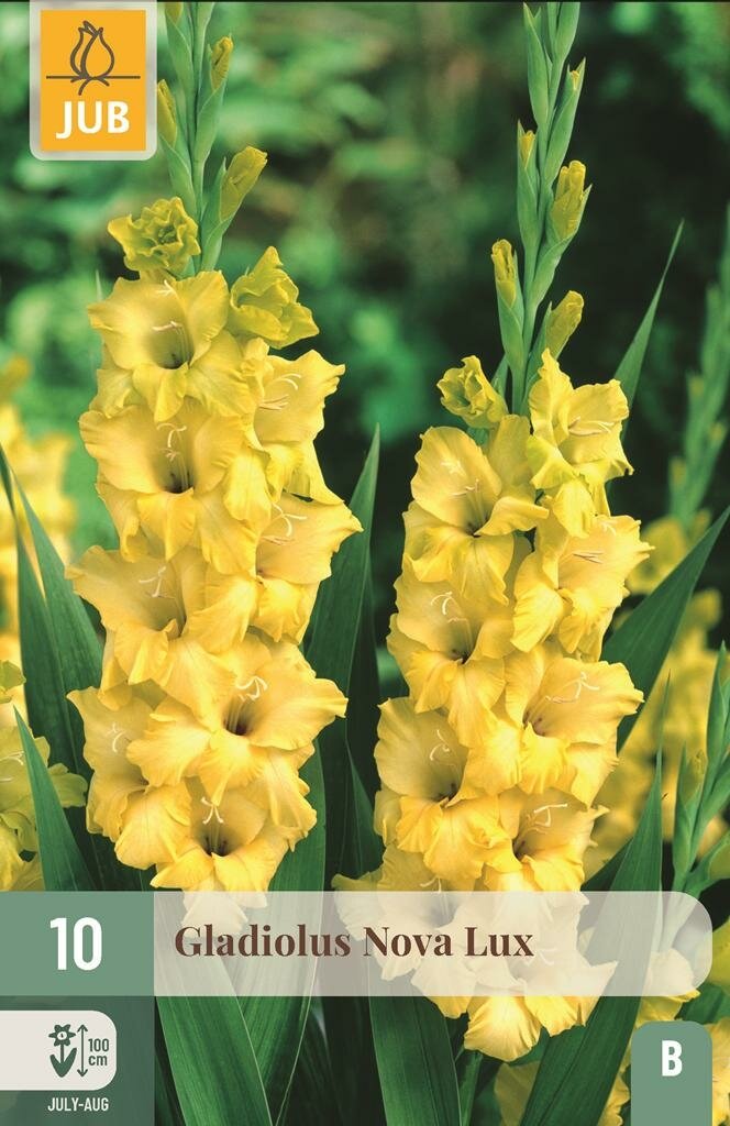 Gladiolen Nova Lux: Stralende gele zomerbloeiers voor je tuin. Breng een vleugje zonnige elegantie in je tuin met de Gladiolen Nova Lux van het kwaliteitsmerk Jub. Deze prachtige zomerbloeiers met hun opvallende gele bloemen zijn een ware blikvanger in elke tuin. De gladiool wordt niet alleen veel gebruikt in zomerse boeketten, maar staat ook schitterend als solitaire plant of in groepen in borders en perken.