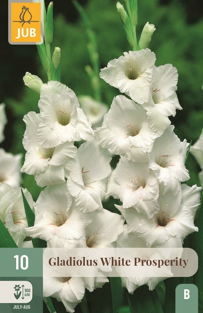 Gladiool White Prosperity: Elegante witte zomerbloeier voor je tuin. Breng je tuin tot leven met de Gladiool White Prosperity, een van de meest indrukwekkende zomerbloeiers uit het JUB-assortiment. Deze statige gladiool met zijn spierwitte bloemen vormt een prachtige blikvanger in borders en bloemperken. De elegante bloemen op stevige stengels van ongeveer een meter hoog zorgen voor een spectaculair zomerbeeld en zijn ook uitstekend geschikt voor zomerse boeketten.