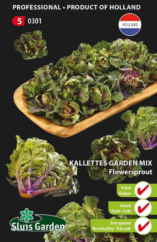 Kalettes Garden Mix Flowersprout: Een unieke kruising voor jouw moestuin. Kalettes Garden Mix Flowersprout is een bijzondere innovatie van Sluis Garden, ontstaan na 15 jaar veredeling. Deze unieke kruising combineert het beste van spruitkool en boerenkool in één gewas. Met zijn milde, zoete en notige smaak én dubbele hoeveelheid vitamines B6 en C ten opzichte van gewone spruitkool, is dit een echte superfood voor jouw moestuin.