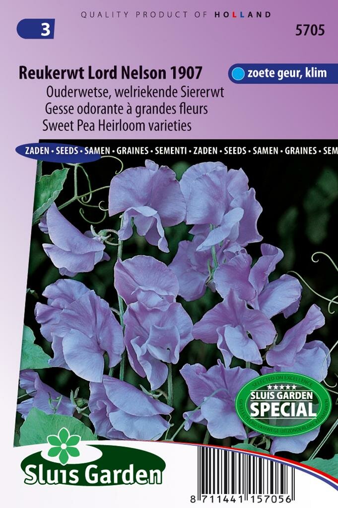 Lathyrus Odoratus Lord Nelson 1907: Elegante reukerwt met Koninklijke allure. Lathyrus Odoratus Lord Nelson 1907 reukerwt is een prachtige historische variëteit met een indrukwekkende stamboom. Deze heerlijk geurende siererwt van het merk Sluis Garden bloeit met 2-3 heldere donkerblauwe bloemen per steel en ontving in 1907 een prestigieuze "Award of Merit". De variëteit werd kort daarna door de firma Burpee in de Verenigde Staten uitgebracht onder de naam "Brilliant Blue".\