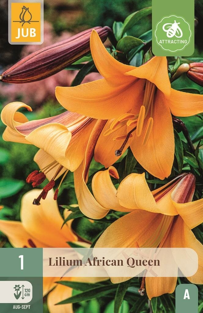 Ontdek de Prachtige Lelie African Queen voor je tuin. De Lelie African Queen is een indrukwekkende Aziatische lelie van het merk Jub die je tuin transformeert met zijn opvallende oranje bloemen. Deze bijzondere lelie kenmerkt zich door de elegante, omgeslagen bloembladen die de bloem een uniek uiterlijk geven. Met een hoogte van 120 cm is deze lelie een echte blikvanger in borders, plantenbakken of als snijbloem in een boeket.