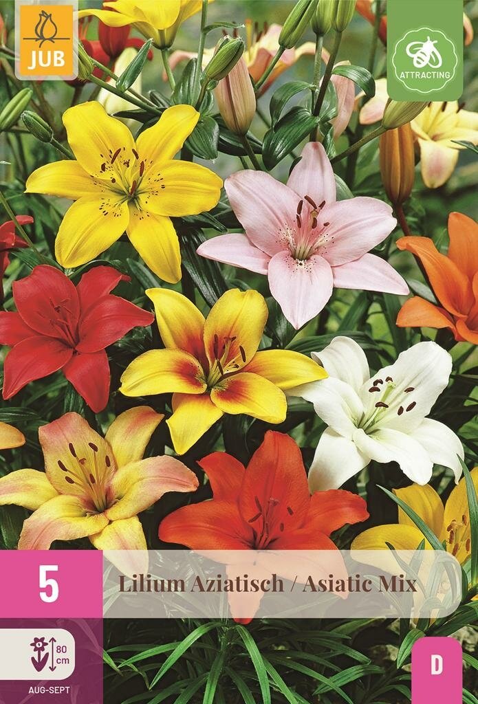 Aziatische Lelie Mix: Kleurrijke pracht voor je tuin. Breng een explosie van kleur in je tuin met de Aziatische Lelie Mix van het kwaliteitsmerk Jub. Deze prachtige mix van lelies zorgt voor een spectaculaire bloei in de zomermaanden. Met hun opvallende kleuren en elegante vorm zijn deze lelies een echte blikvanger in borders, perkjes of plantenbakken.