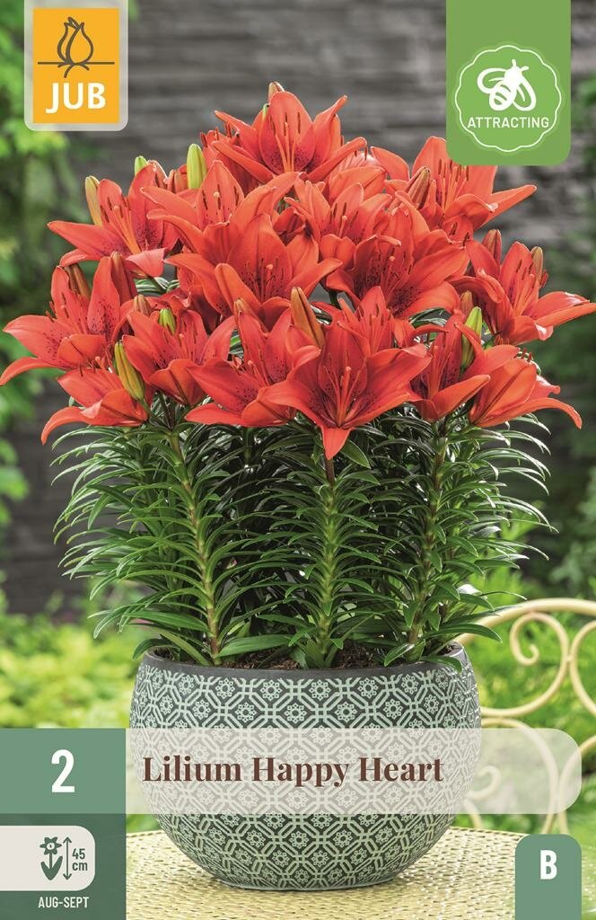 Lelie Happy Heart: Stralende schoonheid voor tuin en pot. De Lelie Happy Heart is een prachtige aanwinst voor elke tuin of terras. Deze opvallende lelie van het gerenommeerde merk Jub kenmerkt zich door zijn schitterende rode bloemen die een ware blikvanger vormen. Met een hoogte van ongeveer 45 cm is deze potlelie perfect voor zowel potten als borders, waar hij vanaf augustus tot september zorgt voor een kleurrijke bloei.