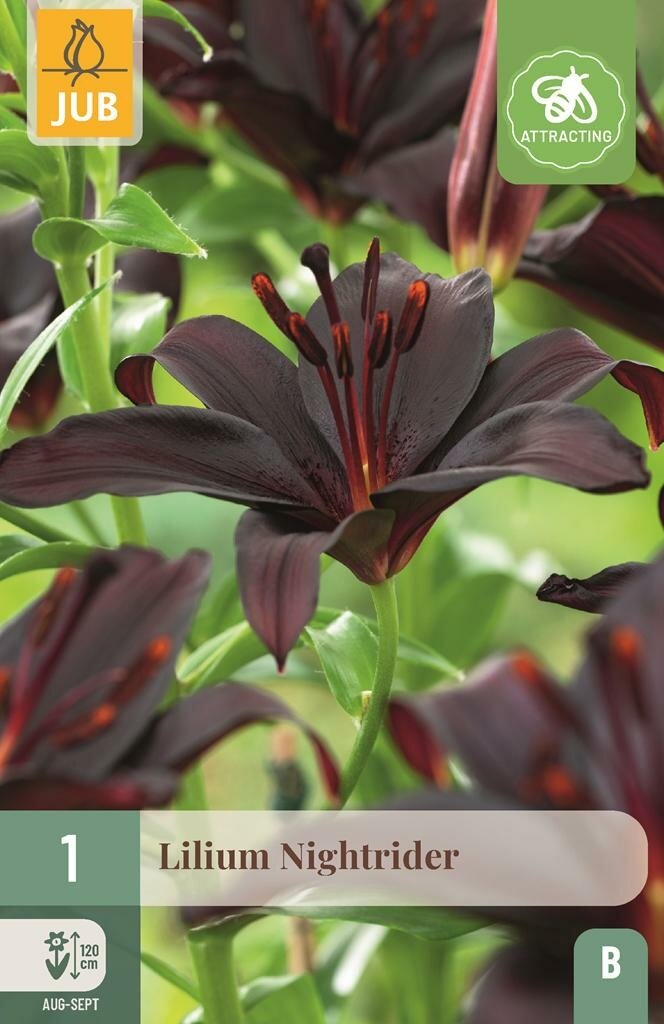 Lelie Nightrider: Elegante donkerrode schoonheid voor je tuin. Ontdek de indrukwekkende Lelie Nightrider, een bijzondere Aziatische lelie van het merk Jub die je tuin transformeert met zijn opvallende donkerrode, bijna zwarte bloemen. Deze statige zomerbloeier bereikt een hoogte van 135 cm en vormt een dramatisch accent in borders en bloemperken. De Nightrider combineert een krachtige uitstraling met de betrouwbare groei-eigenschappen waar Aziatische lelies om bekend staan.