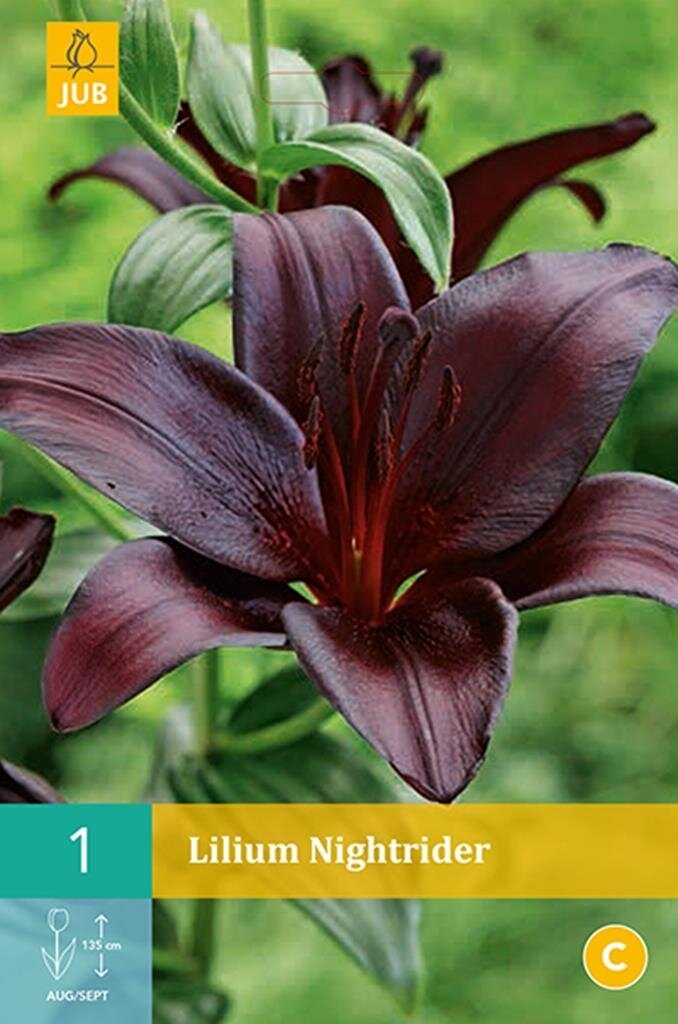 - De lelie Nightrider heeft een mooie donker rode bloem, deze kleurt bijna tegen het zwarte aan. De lelie Nightrider word 135 cm hoog.