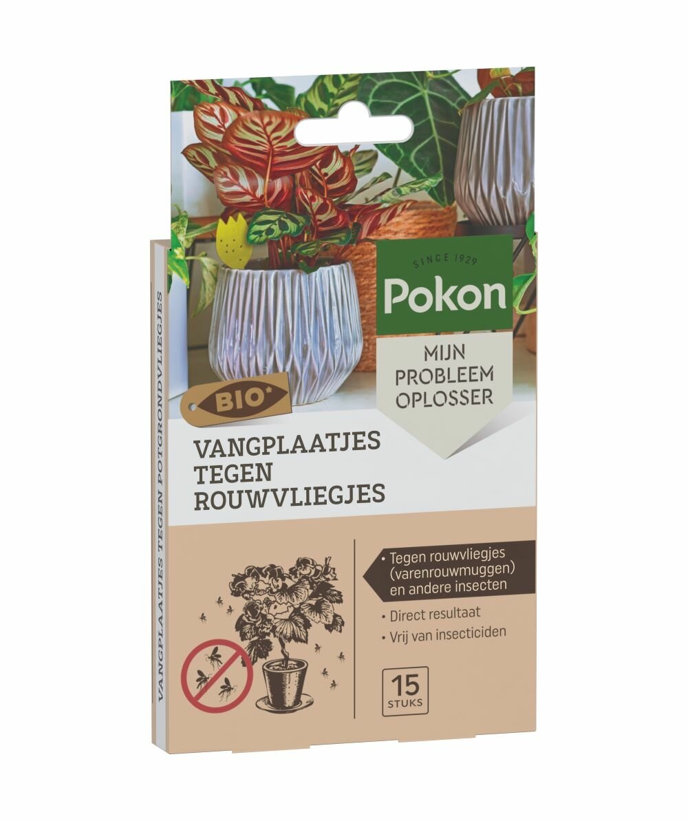 Pokon Bio vangplaatjes potgrondvliegjes: effectieve bestrijding van vliegjes. Pokon Bio vangplaatjes potgrondvliegjes zijn de ideale oplossing voor het bestrijden van vervelende potgrondvliegjes in je kamerplanten. Deze biologische vangplaatjes van het vertrouwde merk Pokon bieden een effectieve en milieuvriendelijke manier om trips, varenrouwmuggen en witte vliegen te bestrijden zonder gebruik van chemische middelen. Met 15 plaatjes per verpakking heb je voldoende materiaal om meerdere planten te beschermen.