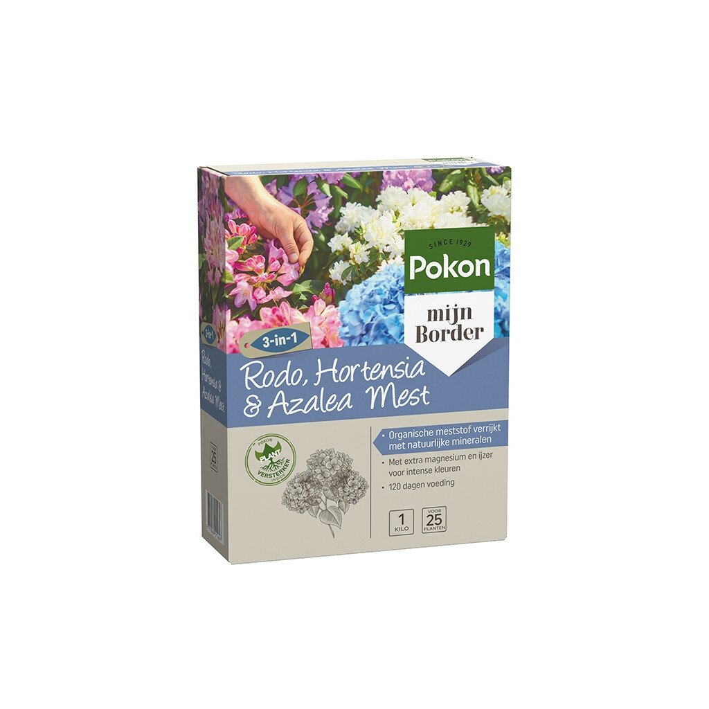 Pokon Rodo, Hortensia & Azalea mest 1 kg. Pokon Rodo, Hortensia & Azalea mest is een speciaal ontwikkelde voeding voor zuurminnende planten zoals rododendrons, hortensia's en azalea's. Deze hoogwaardige meststof van Pokon is perfect afgestemd op de specifieke behoeften van deze planten, waardoor ze optimaal kunnen groeien en bloeien. De uitgebalanceerde samenstelling zorgt voor een gezonde ontwikkeling en prachtige bloemen gedurende het hele seizoen.