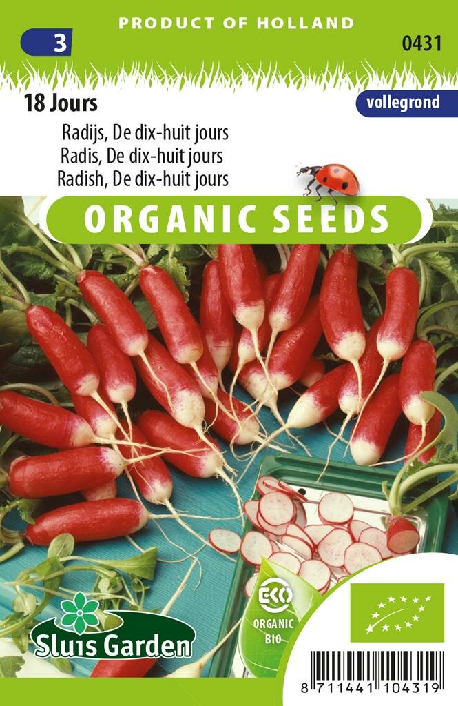 Biologische Radijs 18 Jours: Smaakvolle rode radijsjes met witte punt. Radijs 18 Jours BIO zaden zijn een heerlijke aanwinst voor je moestuin. Deze biologisch geteelde zaden van het merk Sluis Garden produceren smakelijke, lange helderrode radijsjes met een karakteristieke witte punt. Ze zijn bijzonder geschikt voor de vollegrondsteelt en leveren een smakelijke groente op die gemakkelijk te telen is.