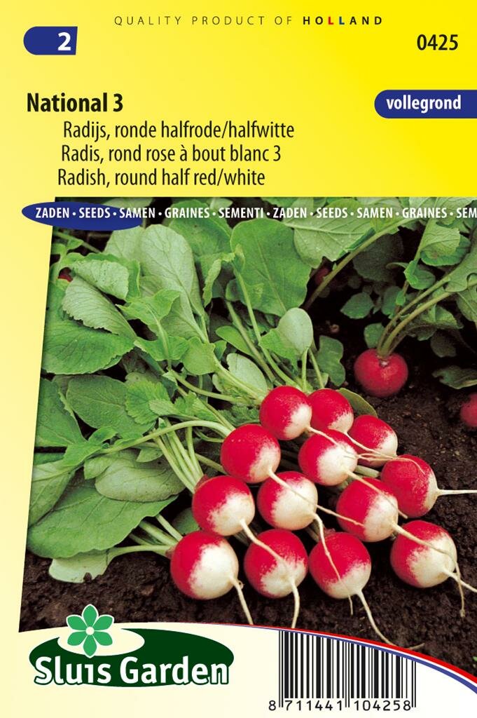 Radijs zaden National 3: Smaakvolle en gemakkelijk te telen radijsjes. Radijs zaden National 3 van Sluis Garden zijn halfrode/witte ronde radijsjes die perfect geschikt zijn voor teelt in de volle grond. Deze smakelijke groente is niet alleen lekker, maar ook leerzaam en leuk om samen met kinderen te kweken. De radijsjes groeien snel en zijn redelijk resistent tegen voosheid, wat ze tot een ideale keuze maakt voor zowel beginnende als ervaren tuinders.