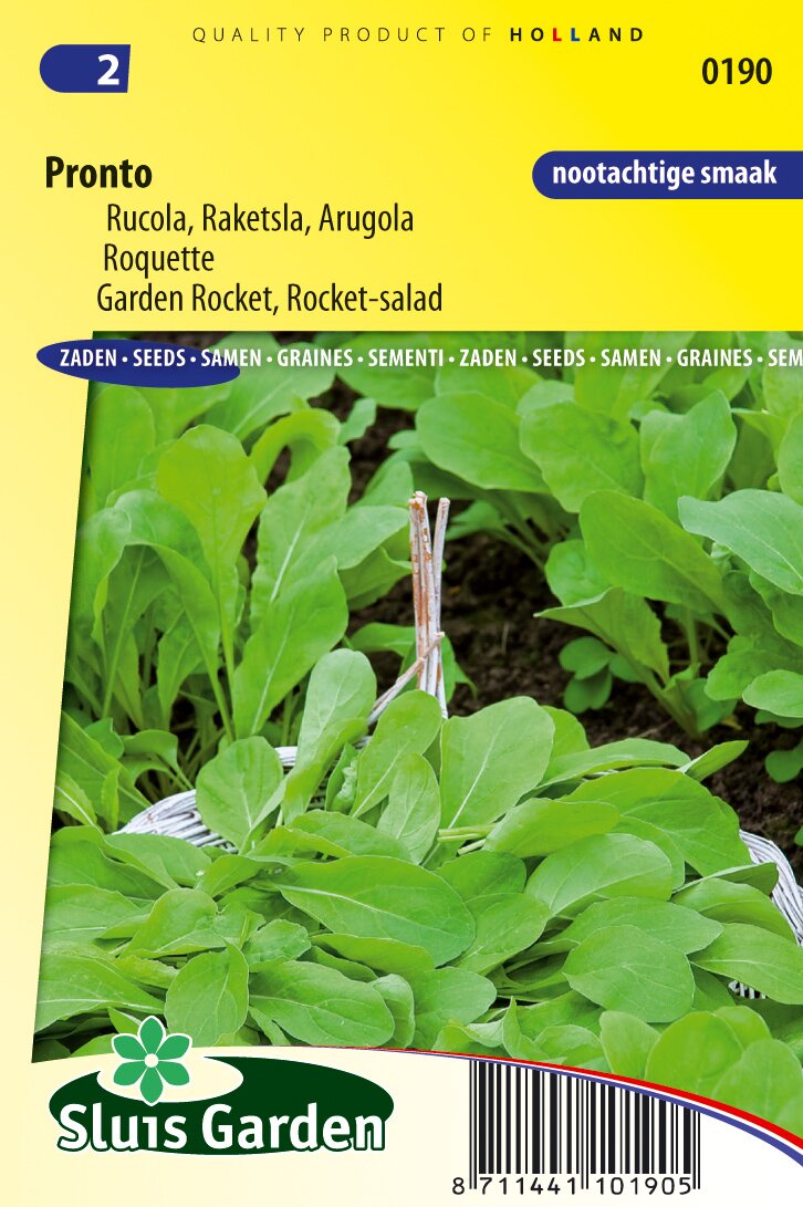 Rucola Raketkruid Pronto: Smaakvolle bladgroente voor je tuin. Rucola Raketkruid Pronto van Sluis Garden is een verfijnde bladgroente met diep en fijn ingesneden groen blad. Deze verbeterde rucola variant kenmerkt zich door een prettig pikante, nootachtige smaak met een licht peperige toets. Perfect voor liefhebbers van smaakvolle salades en als garnering bij diverse gerechten. Je kunt deze rucola het hele jaar door kweken, zelfs in de winter binnenshuis.