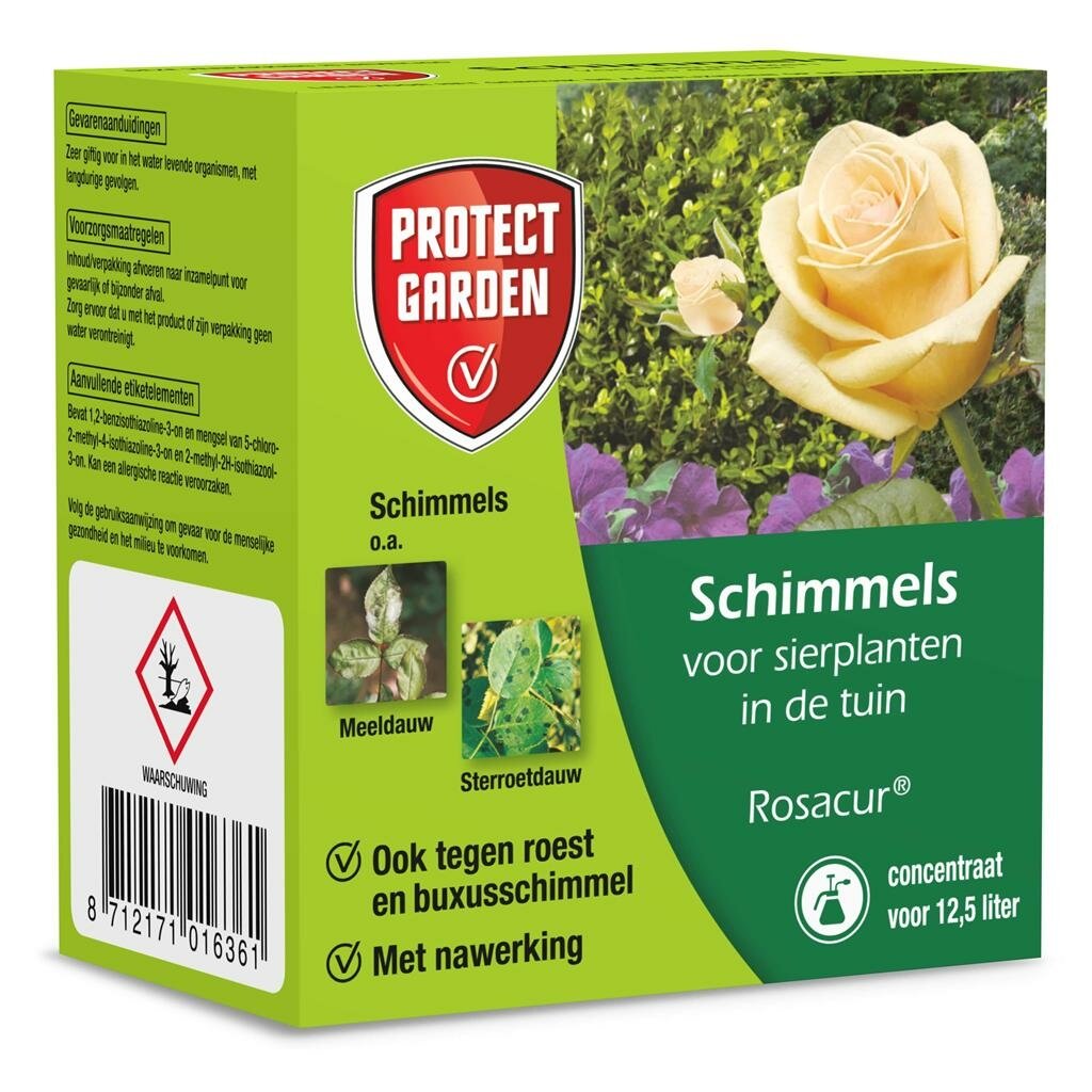 Protect Garden Rosacur® 50ml: Effectieve schimmelbestrijding voor je tuin. Protect Garden Rosacur® 50ml is een krachtig bestrijdingsmiddel tegen diverse schimmelziekten in je tuin. Dit product van SBM Bayer is speciaal ontwikkeld voor de bestrijding van sterroetdauw, meeldauw en roest op sierplanten en kamerplanten. Daarnaast is het ook zeer effectief tegen de gevreesde buxusschimmel, waardoor je planten weer gezond kunnen groeien.