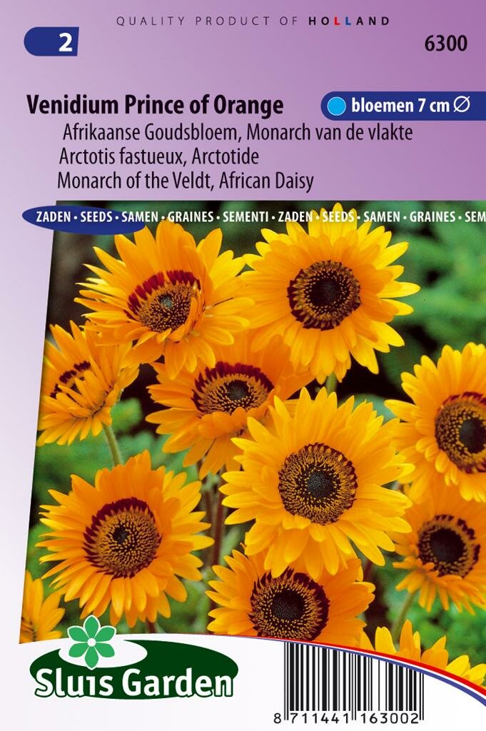 Venidium Fastuosum Prince of Orange: Exotische schoonheid voor je tuin. Venidium Fastuosum zaden Prince of Orange, ook bekend als Afrikaanse goudsbloem, is een opvallende eenjarige plant van het merk Sluis Garden. Deze bijzondere tuinplant kenmerkt zich door levendige oranje bloemen met een donker hart en diep ingesneden zilverachtig groen blad. Met zijn exotische uitstraling is deze plant een echte blikvanger in borders, perken en grote potten. De 35 cm lange stelen en bloemen met een diameter van 7 cm maken deze plant zowel in de tuin als in de vaas tot een ware verschijning.